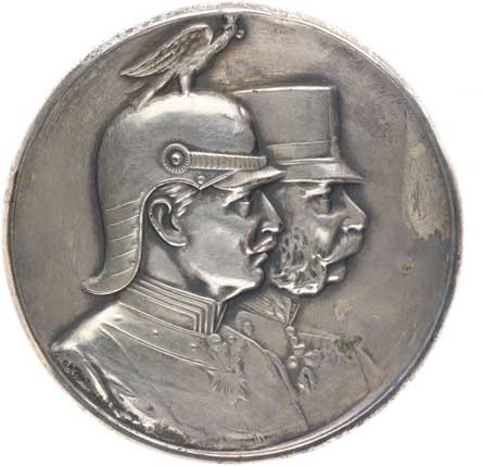 Vilém II. a Frant.Jos.I. - dvojportrét zprava, b.l. Sign.A.K., Postř.plech.medaile 77 mm, 15,34 g
