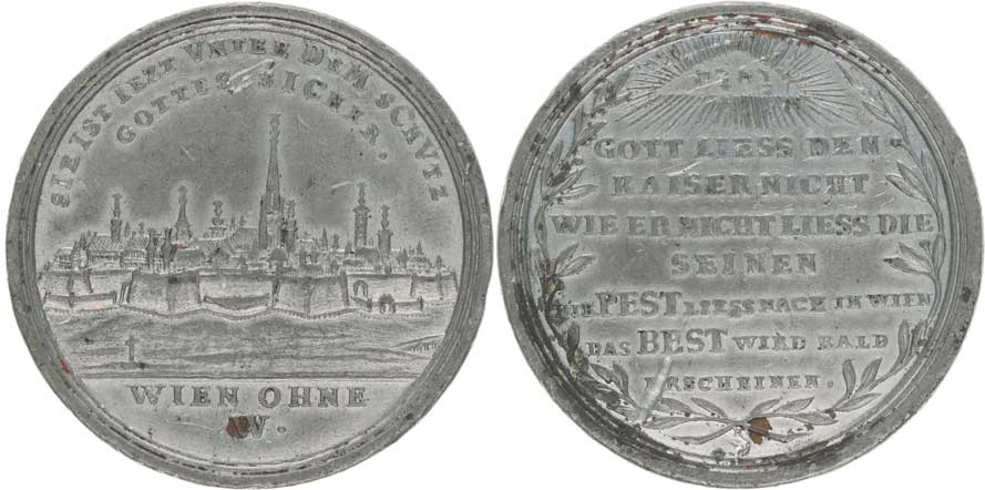 Vídeň - medaile na ukončení morové nákazy v r.1714 Pohled na město, 2řádk.nápúis v úseči, dvojitý opis / 7řádk.nápis ve věnci, Sign.H. (C.Hoffmann), Sn 44 mm, Mo.1436_R!