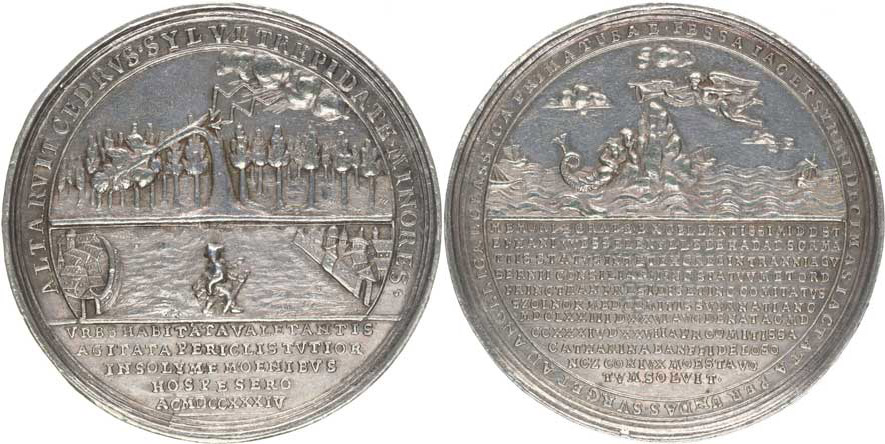 Stephan Wesseleny von Hadada - úmrtní medaile z r.1734, věnovaná manželkou Catharinou Banffy, zlomený strom, postava kráčející do podsvětí, 5řádk.nápis, opis / rozbouřené moře se skalisky11řádk.nápis, opis, Ag 48 mm, 39,39 g, Resch.136_R!