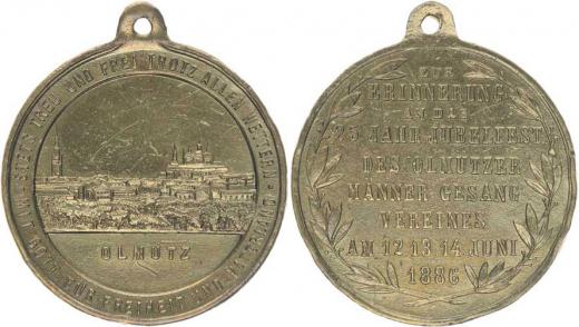 Olomouc (Olmütz) - na 25.výr.olomouckého mužského pěveckého spolku Panorama města, opis / 9řádk.nápis ve věnci 1886 Nesign., Bronz 33.5 mm, Taul.467_orig.raž.ouško