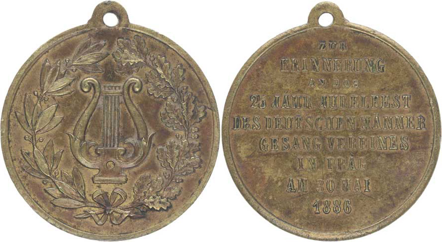 Praha (Prag) - v upomínku na slavnost 25.výročí německého mužského pěveckého spolku v Praze 30.5.1886 Lyra ve věnci / 9řádk.nápis, Bronz 33 mm_orig.ouško