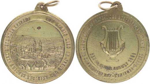 Šternberk (Sternberg) - na památku 40.výročí mužského pěveckého spolku 14., 15., 16. 8. 1886, pohled na město, opis / lyra, opis Nesign., Mosaz 34 mm_orig.raž.ouško
