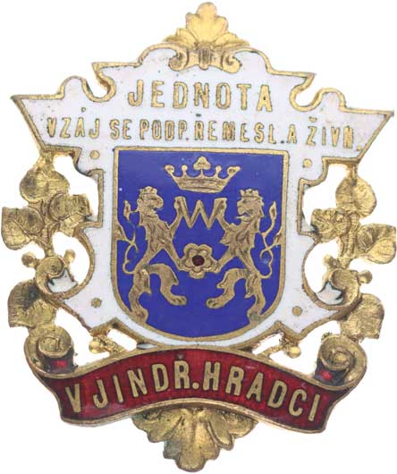 Jindřichův Hradec - Jednota vzáj. se podp.řemesl. a živn., b.l. Smaltov.odznak 35x42 mm_chybí připínání