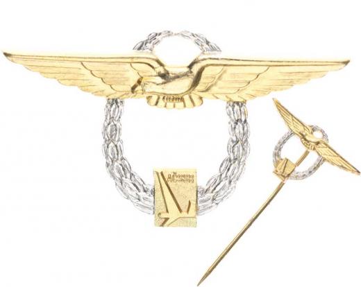 Odznak ARČS - pilot motorového létání, I.výk.třída, Tombak, znač.Zukov Praha 7, Kr.33-XI/I-4_připínací Miniatura Odznaku ARČS - pilot motor.létání, Tombak, Kr.33-XI/I-5_s jehlou