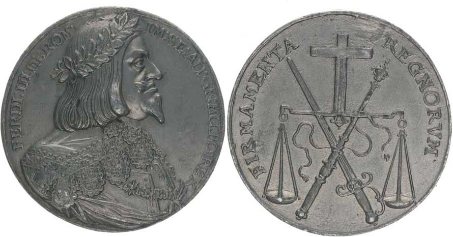 G.Schweigger - medaile na korunovaci v Řezně, b.l. Poprsí zprava, opis / FIRMANENTA REGNORVM, váhy s žezlem a mečem, Sn 42 mm, 28,84 g, jako Nov.XII/I-12c, jako Do.2342