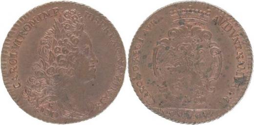 P.L.II.Roëttiers - na holdování v Namuru 1717 Poprsí zprava, opis / lev zleva v ozdobné kartuši, opis Sign., Bronz 30 mm, 9,92 g, Nov. XI/V-1a, Mo.1492, LG.XV/714