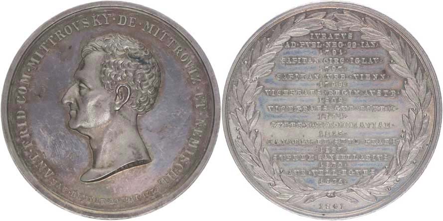 Životopisná medaile, 1841 ( od r.1815 morav.gubarnátor), 1841#Ag Hlava zleva, opis / ve věnci životopisná data, Sign.J.Schön, Nepunc., Ag 50 mm, 43,59 g, Mo.2847, Ho.7485, Do.3606, MZČ.139/5, MN.283