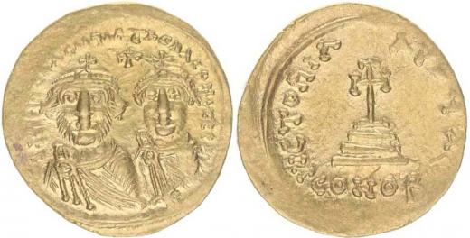 AV Solidus, "HERACLIUS.ET.HERA.CONST.P.F.AVG.", dvojportrét zpředu / "VICTORIA.AVG.", stylizovaná Golgota 4.46 g, Ra.1355