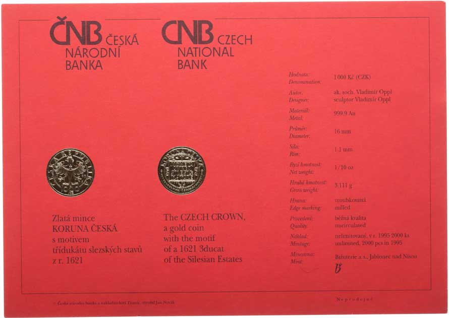 Karta (certifikát) pro minci 1000 Kč 1995 - třídukát Slezských stavů
