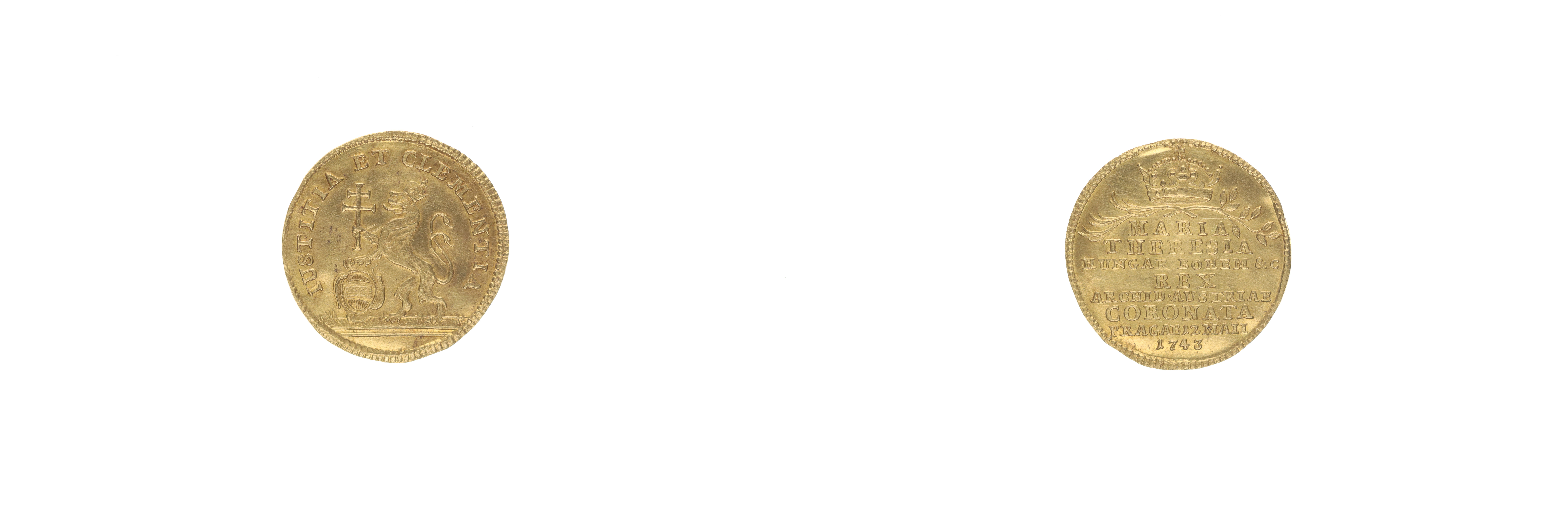 Menší korunovační žeton na korunovaci v Praze 12.5.1743 Korunovaný lev se znakem a křížem, opis / 8řádk.nápis pod korunou Au 21 mm, 2.69 g, Nov.XIII/G-3a, ČS.1313_RR!