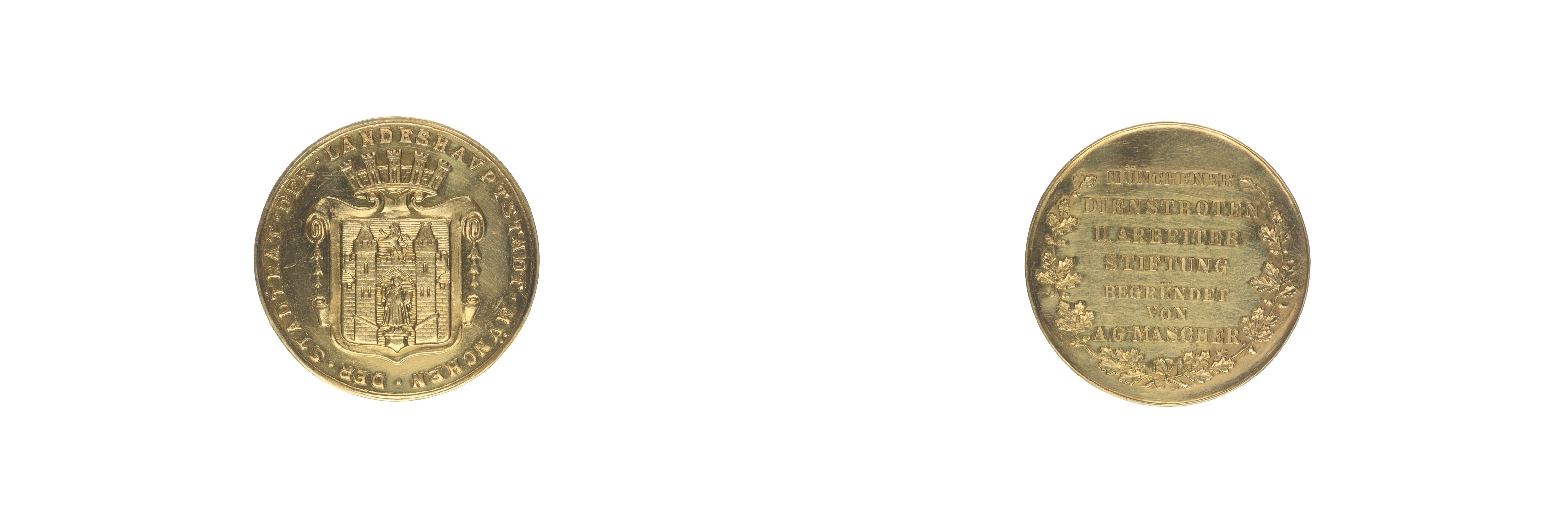 Nesign. - medaile městské rady v Mnichově - zřízení nadace A.G.Mascherem, b.l. (cca 1930), korunovaný znak města, opis / 7řádk.německý nápis ve věnci, na hr.punc.985 Au 30 mm, 13,74 g_R!