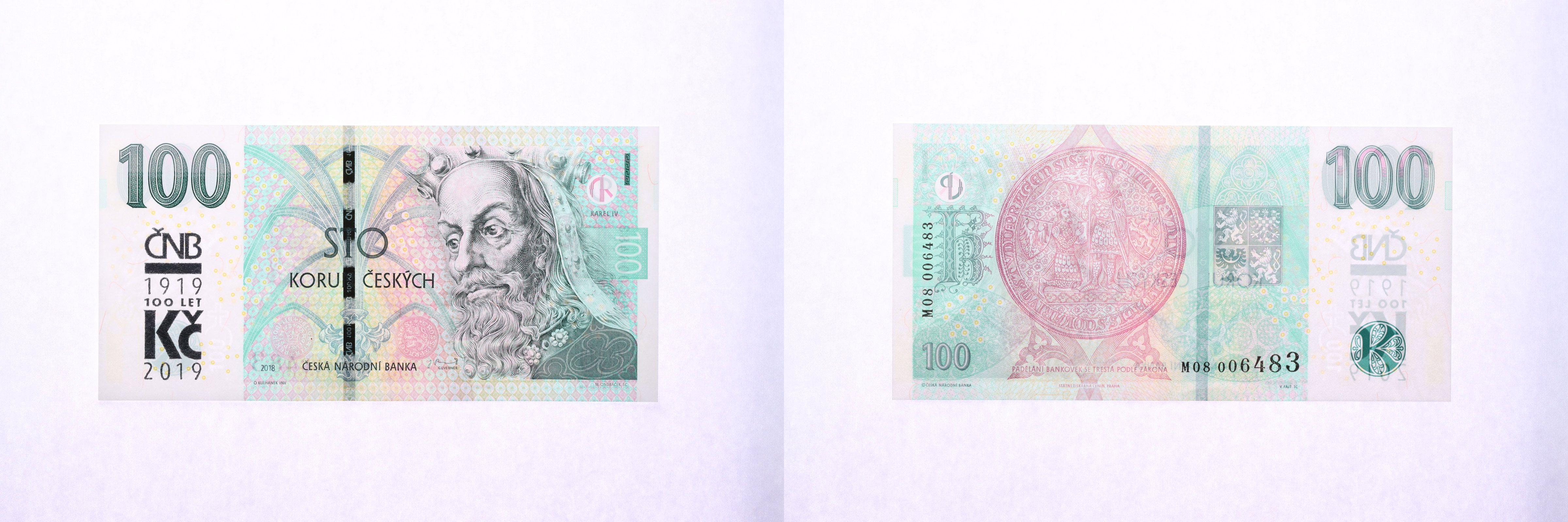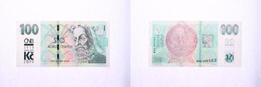 100 Kč 2018, sér.M08 s přítiskem ČNB 100 let Kč 1919-2019 He.CZ33_"neperf."