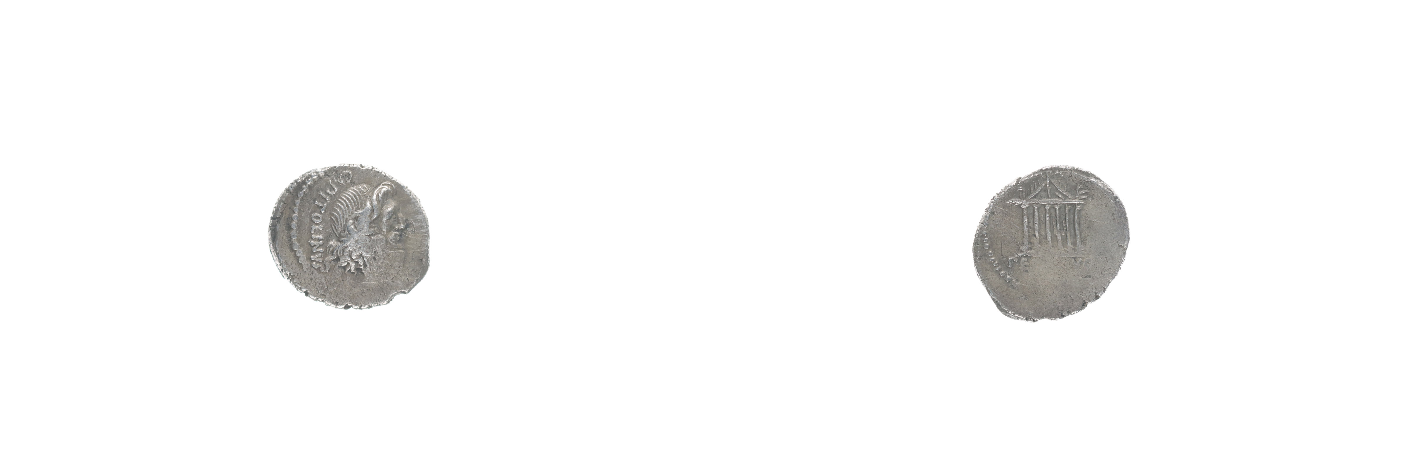 AR denár, hlava Jupitera zprava / sloupový chrám Craw.487/1, Ves.1392_č.ned.