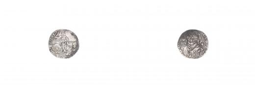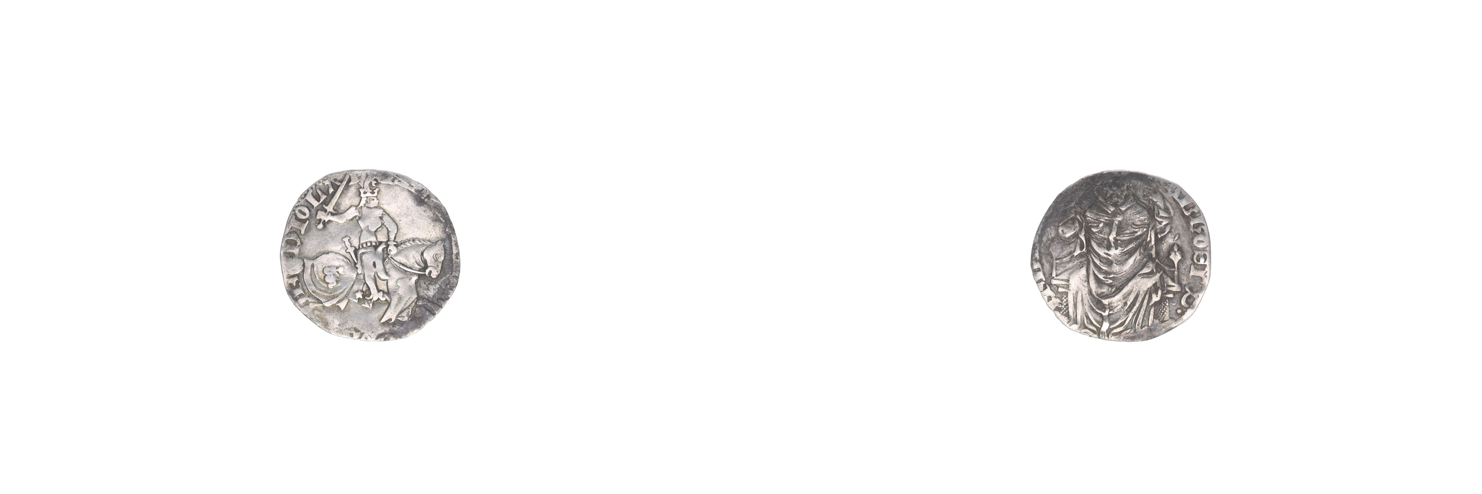 Groš b.l., jezdec s mečem na koni zprava / sv.Ambrož čelně Wind.3397pod. (Au)_okrájený R!
