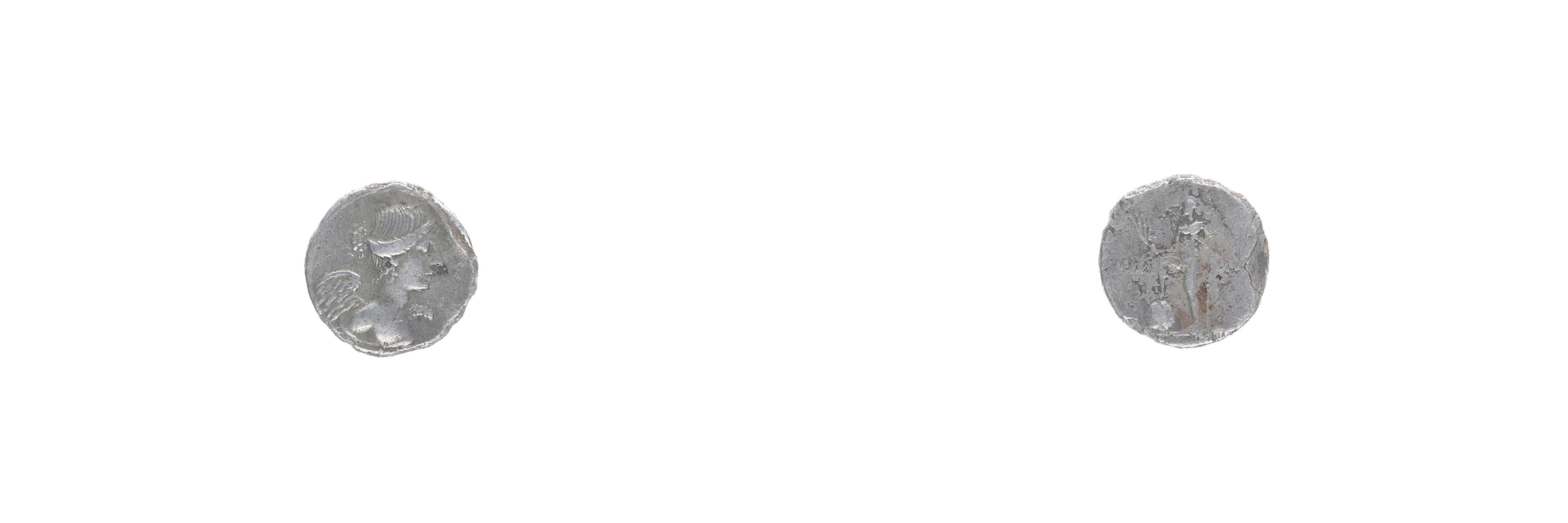 AR Denár, poprsí Victorie s křídly zprava / stojící Octavián s nohou na globu, Ves.1552, RIC.256
