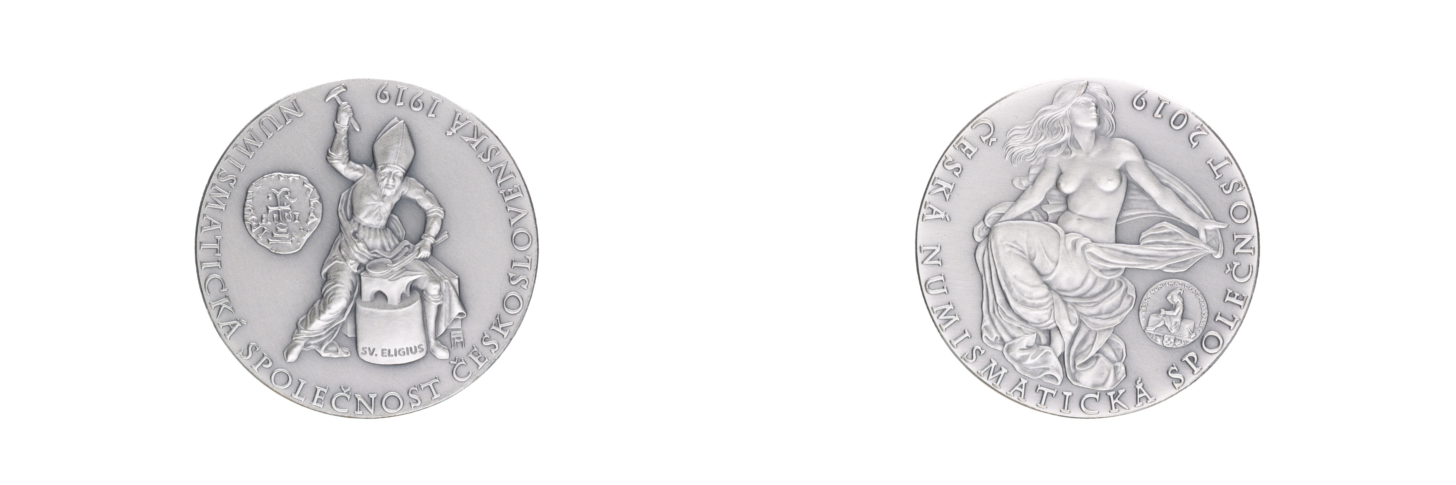 M.Filová - medaile k 100.výročí založení České numismatické společnosti - 1919 - 2019, sedící sv.Eligius, opis / sedící alegorická ženská postava, opis, Sign., ryz.999/1000, Ag 50 mm, 63,3 g (3 unce) MF.A1/47b_orig.etue