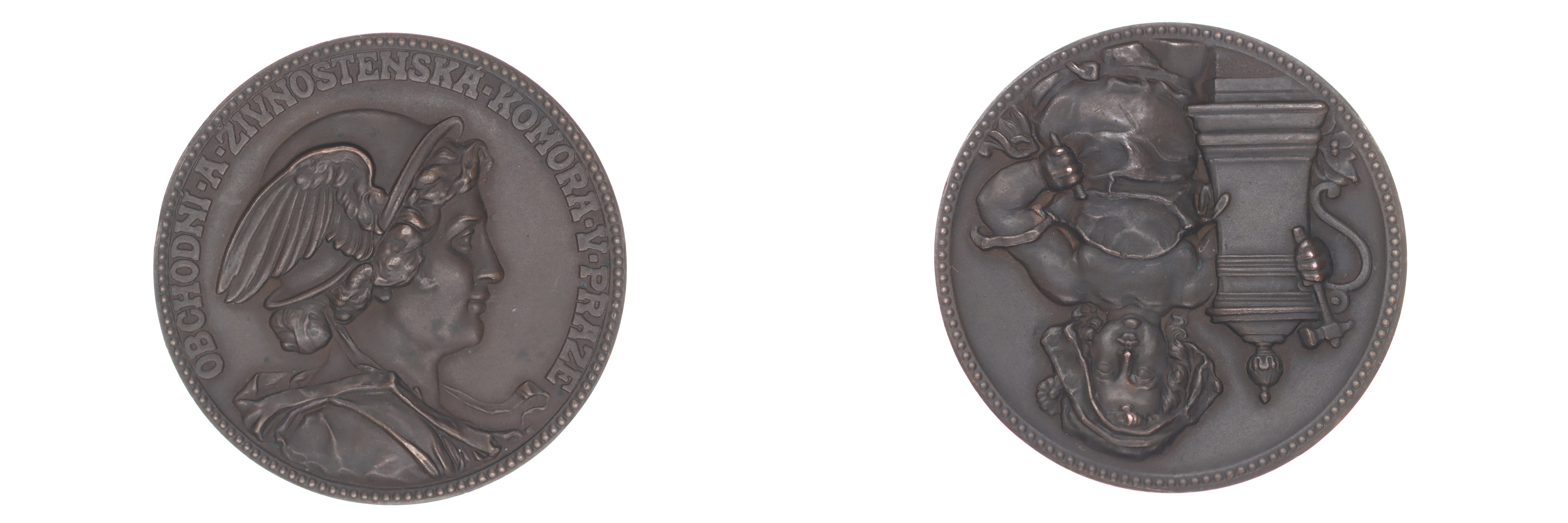 Obchodní a živnostenská komora v Praze, b.l.#Br Poprsí Merkura zprava, opis / Dětská postava drží korbel, kladivo a sekáč, Sign., Bronz 50 mm, 59,68 g