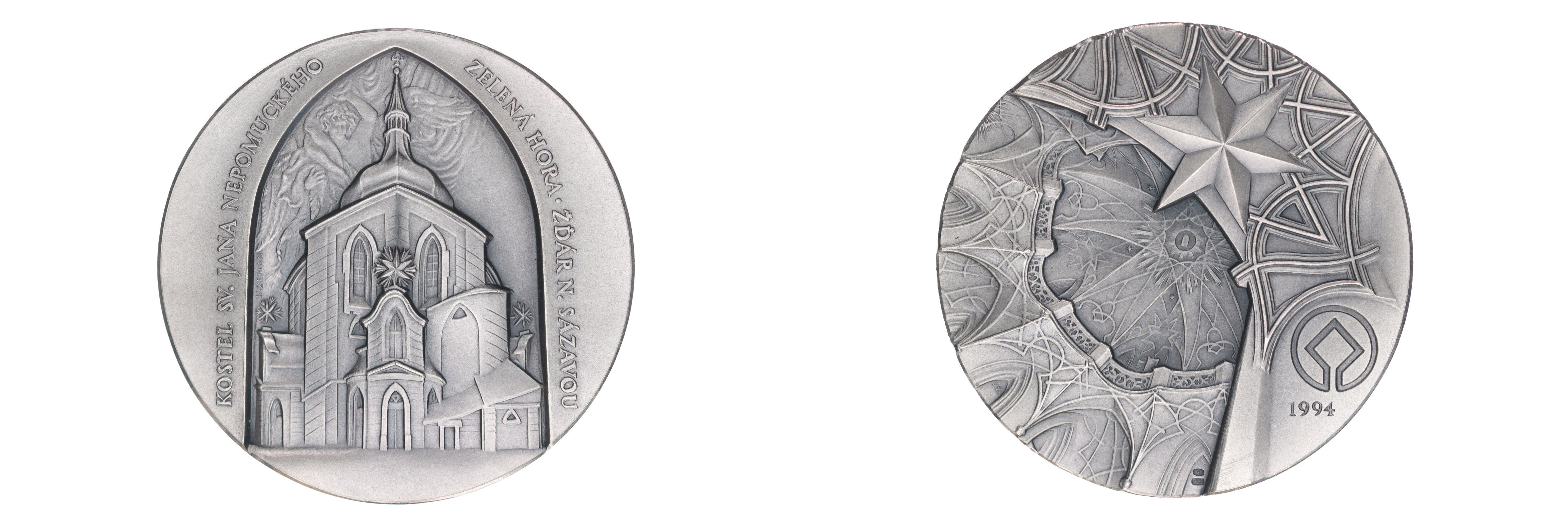 Zelená Hora - Žďár nad Sázavou - kostel sv.Jana Nepomuckého 1994 Pohled na kostel v gotickém oblouku, opis / pohled na strop kostela, šesticípá hvězda, vročení, Sign.K.Zeman, Punc.Ag 50 mm, 58,98 g