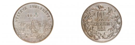 Výstava Zvoleněves 1927- Za zásluhy, pohled na obec, opis / 2řádk.nápis v ozdobném věnci, Sign.Štorek, Pichl, Postř.bronz 50 mm_dr.škr. R!
