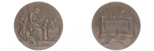D.Dupuis - školní medaile 1908, žena se čtyřmi dětmi / otevřená kniha s věnováním na jméno "Mme MISLINSKI KIRPOTIENKO" Nancy 1908, sign., Bronz 68 mm, 122,83 g