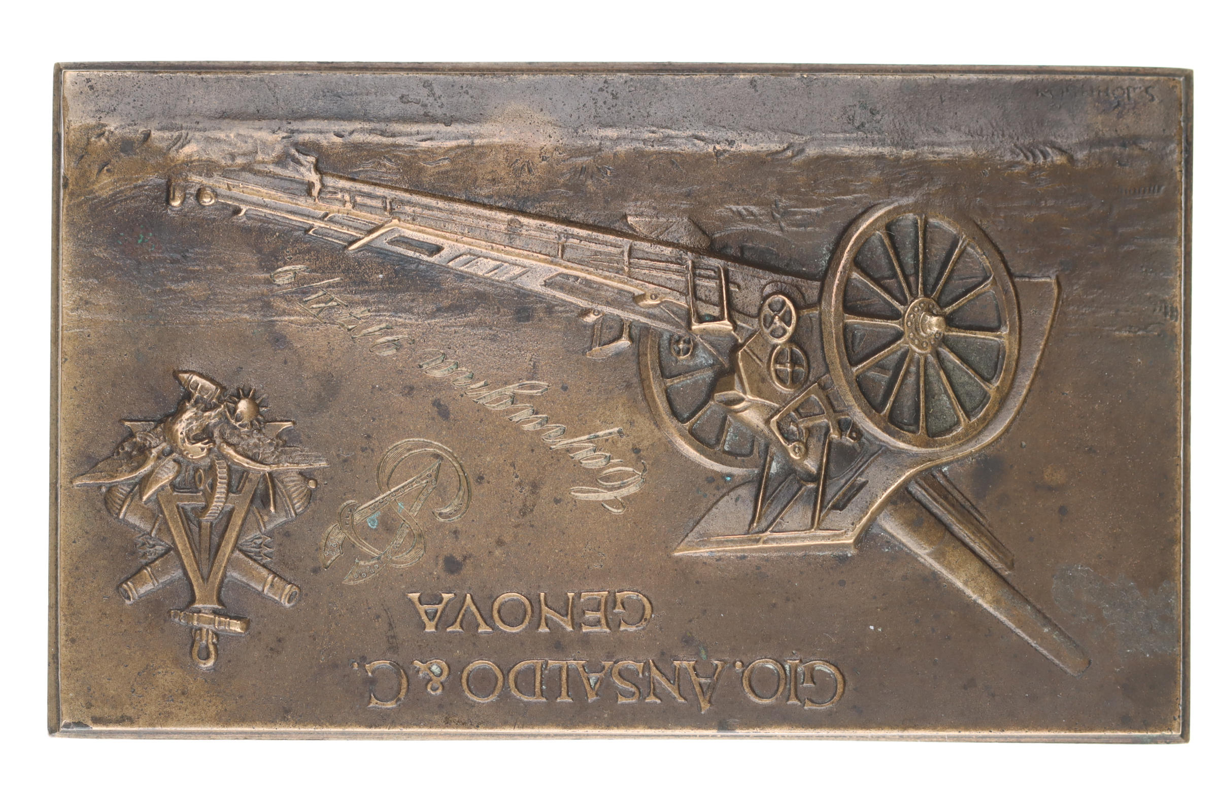Janov - plaketa firmy Giovanni Ansaldo, b.l. (1917) Polní kanón zleva, v horním rohu logo firmy používané v letech 1912-17, vyryto Capagna 917/XI/9, Sign.S.Jonnson Bronz plaketa 71x118 mm, 453,77 g_jednostranná R!