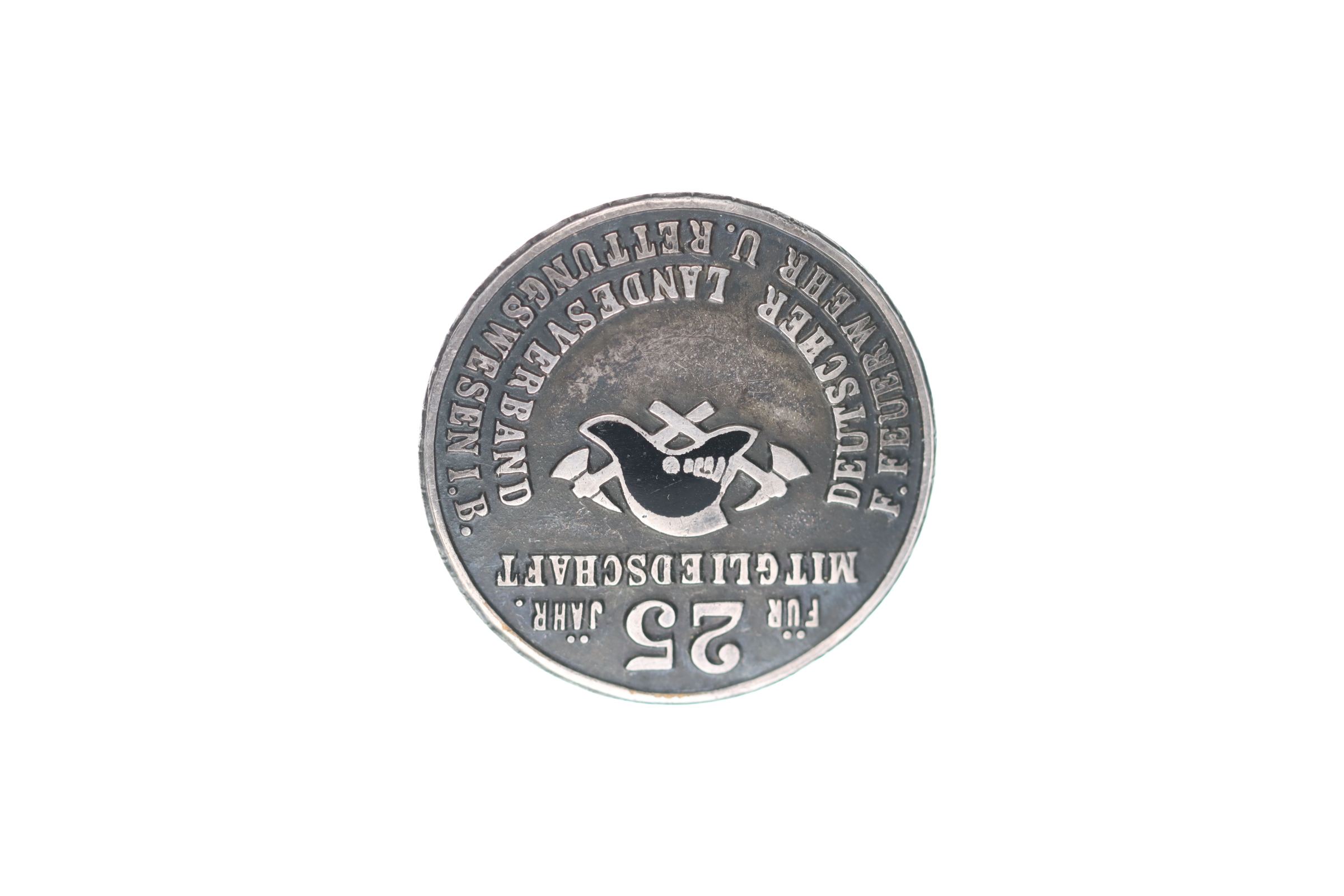 Německý zemský spolek - za 25leté členství v dobrovolném hasičském a záchranářském sdružení, hasičské atributy, 2řádk.nápis, 2řádk.opis v úseči, Kruh.odznak z bílého kovu 32 mm_připínací