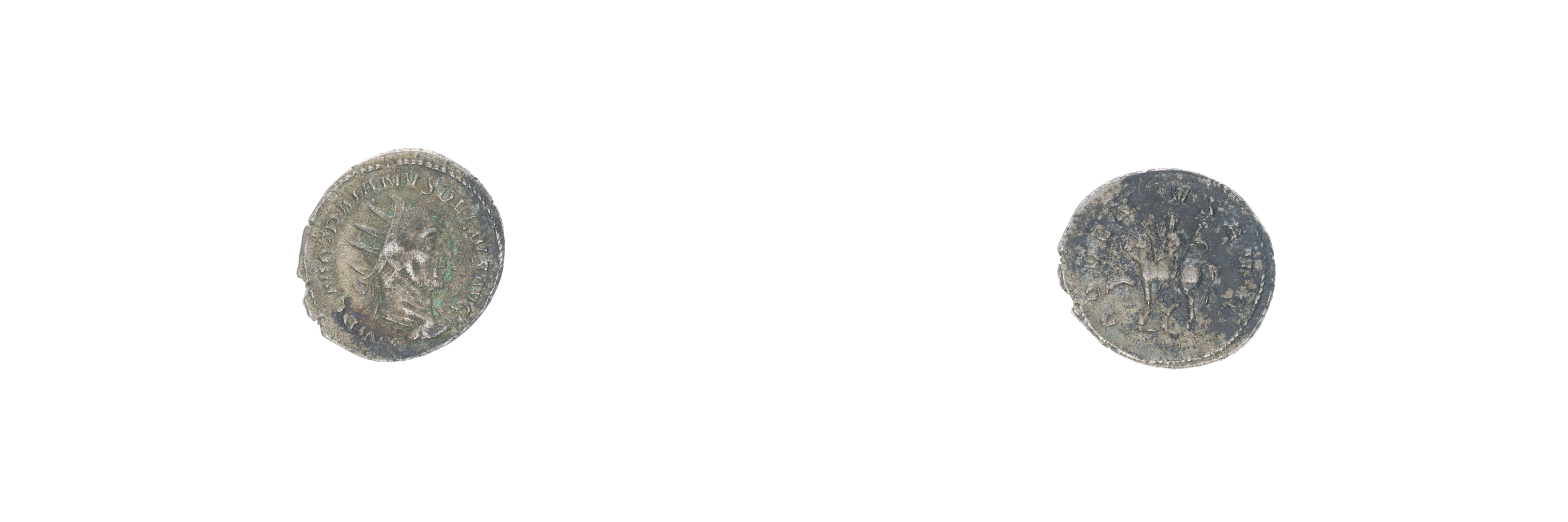 AR Antoninianus, Rv: "ADVENTVS.AVG", císař ve zbroji na koni zleva, S.2591, C.4, RIC.116, K.79.2