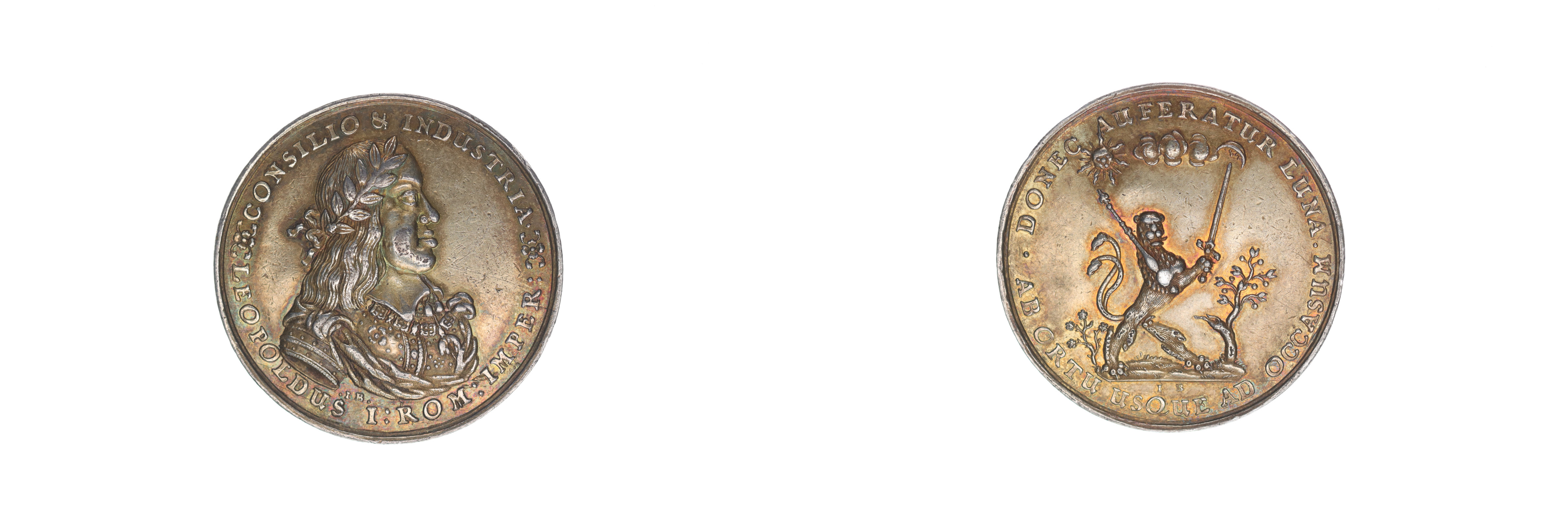 I.B. (J.Buchheim Vratislav) - medaile na vítězství nad Turky a Francií, b.l. (kolem r.1683), poprsí zprava, opis / lev zprava s mečem a žezlem mezi stromem a květinou, Ag 37 mm, 15,00 g, Ho.2045, Fr.4099, LG.XV/32 (popisuje k císařské korunovaci)_R!