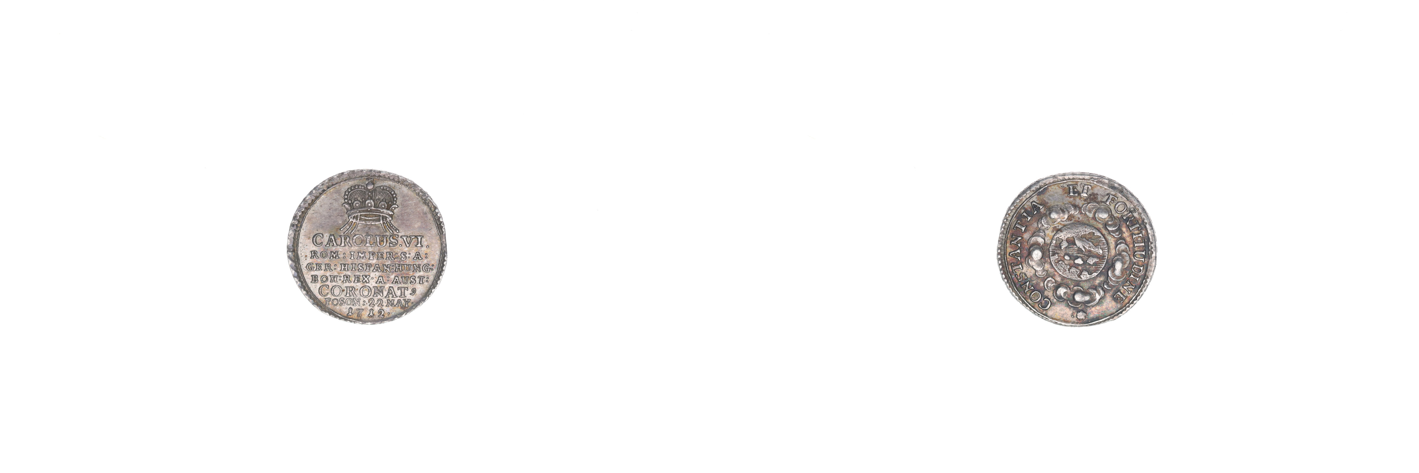 Menší peníz na korunovaci v Bratislavě, 22.5.1712 Koruna, 7řádk.nápis / zeměkoule v oblacích, opis, Nesign., Ag 19 mm, 1,92 g, Mo.-, Nov.XI/M-20b