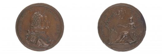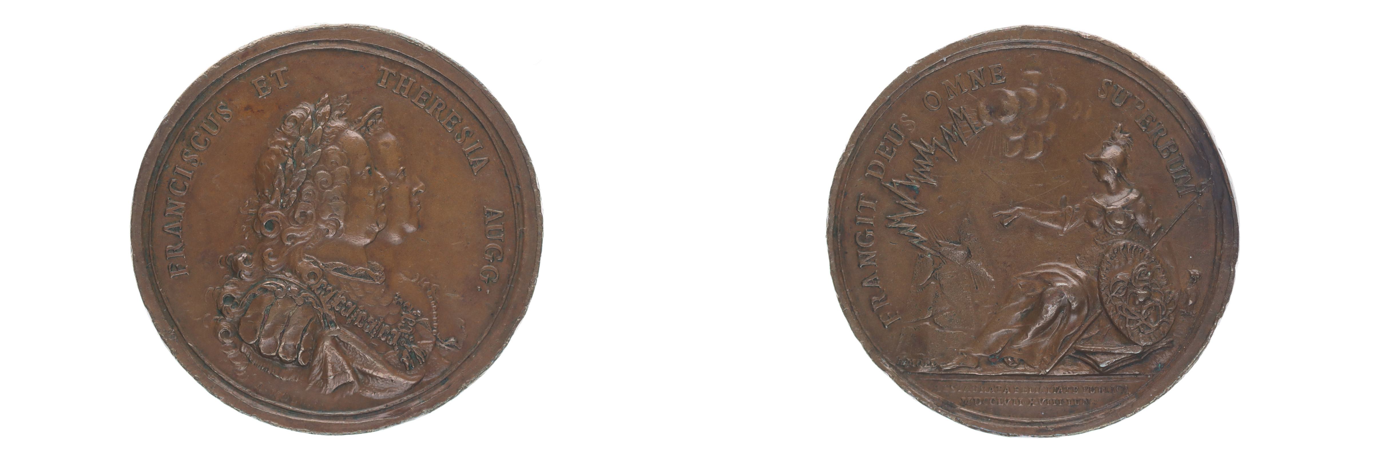 A.Moll - medaile na odchod Prusů z Čech 18.6.1757 Dvojportrét zprava, opis / sedící Victoria se štítem, blesky nad pyramidou, opis, Sign., 50 mm, 43,6 g, Mo.1854, LG.XIV/139 _dr.hry R!