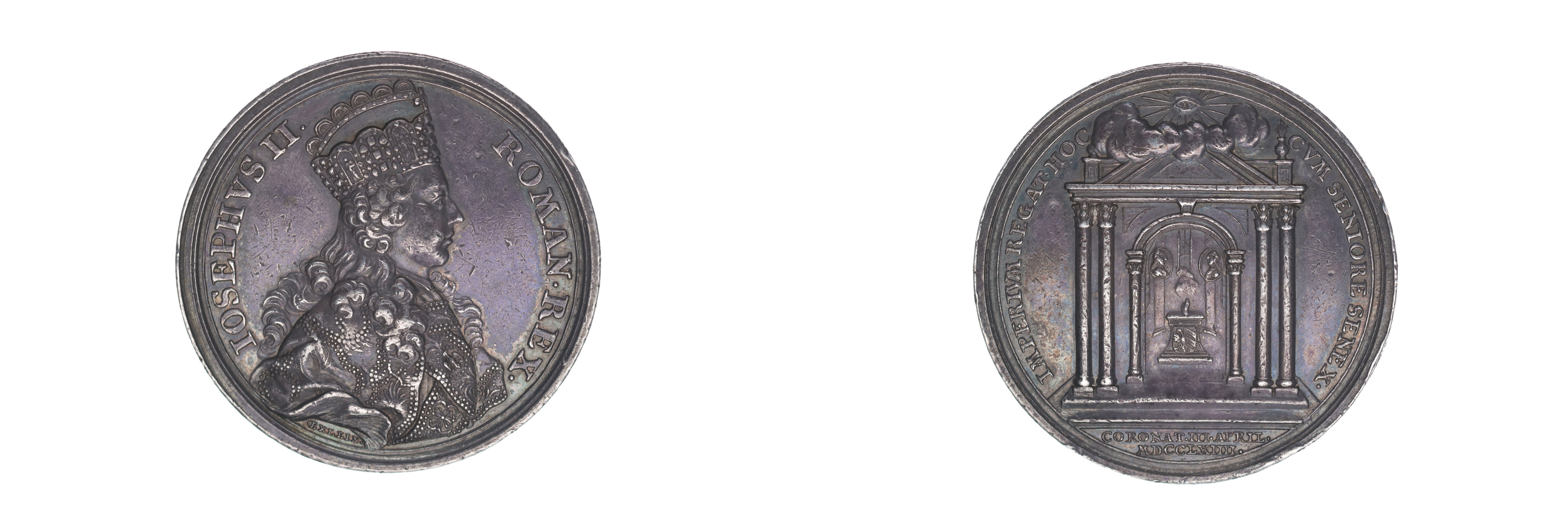 Oexlein - medaile ke korunovaci na římského krále 3.4.1764 Poprsí zprava, opis / pod Božím okem brána s oltářem s plamenem, 2řádk.nápis v úseči, opis, Sign., Ag 45 mm, 29,16 g Mo.-, Nov.XV/C-5a, LG.XIV/179, Ho.3126_R!