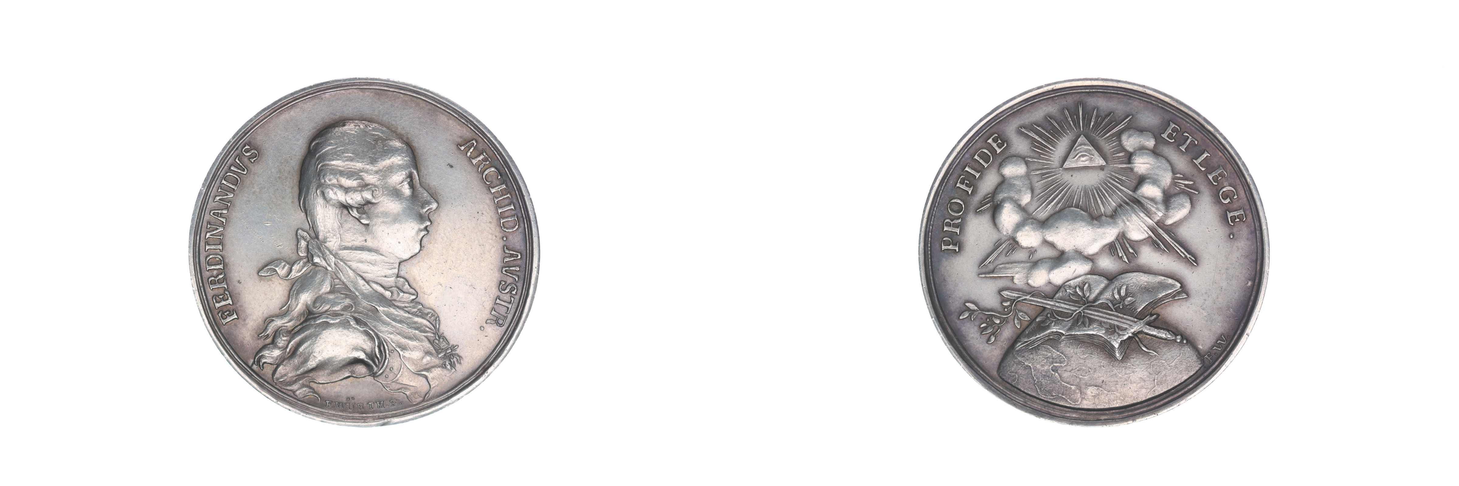 F.Würth - medaile na arcivévodu Ferdinanda, b.l. Poprsí zprava, opis / PRO FIDE ET LEGE, pod Božím okem zeměkoule, na ní zákoník s mečem, Sign., Ag 42 mm, 26 g, LG.XIV/127, Mo.1880_R!