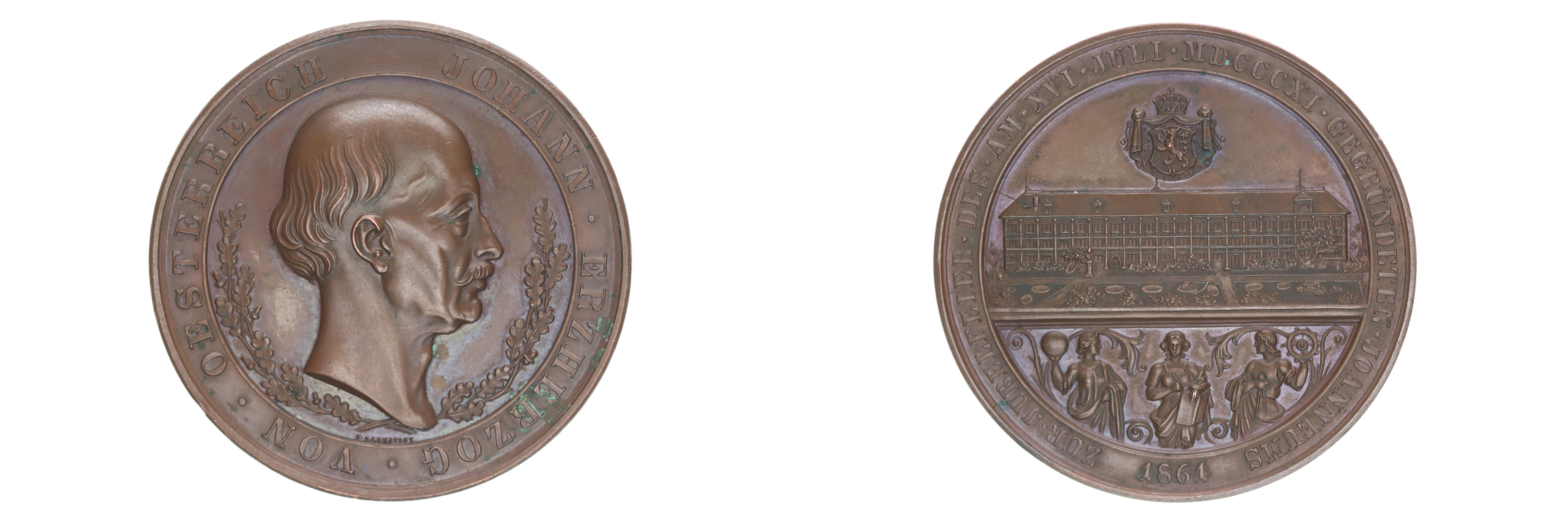 C.Radnitzky - jubilejní slavnost na 50.výr. založení Johannea v Grazu 1811 - 1861, poprsí arcivévody ve věnci zprava, opis / pod korunovaným štýrským znakem pohled na budovu, Bronz 50 mm