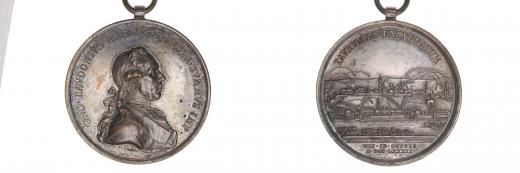 Donner - medaile na dobytí Bělehradu, 8.X.1789#Postř Poprsí zprava, opis / město s minarety v dělostřelecké palbě, opis a nápis, Sign., Postř.bronz 47 mm, Ho.7433 (Ag), Mo.2181 (Ag), Marko.335_orig.ouško se závesem