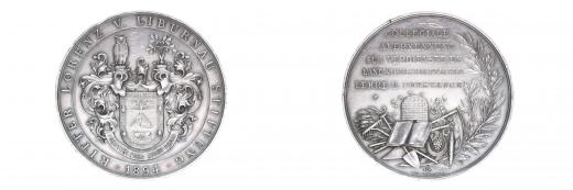 Schwertner - medaile na nadaci pro učení a výzkum v zemědělství 1894 Velký rodový znak, opis / 5řádk.nápis se zeměděslkými atributy Sign., Punc., Ag 64 mm, 64,11 g, Haus.3323_dr.škr., dr.hry