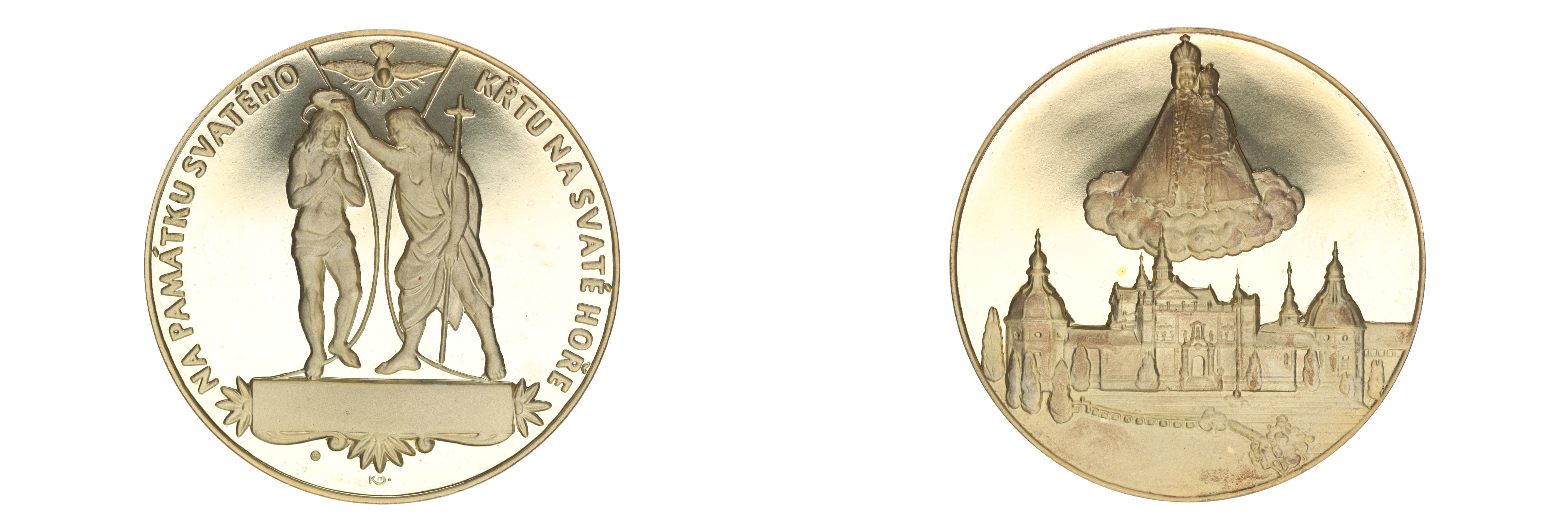 Na památku svatého křtu na Svaté hoře, b.l. Pod Duchem svatým křtí sv.Jan Krista, opis / Panna Marie na oblaku, pohled na klášter, Sign.KJ+MK, Pozlac.med.50 mm