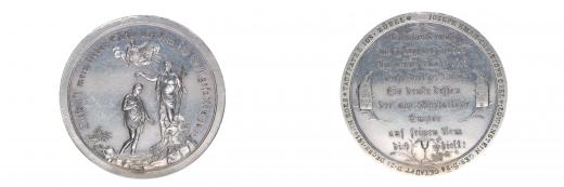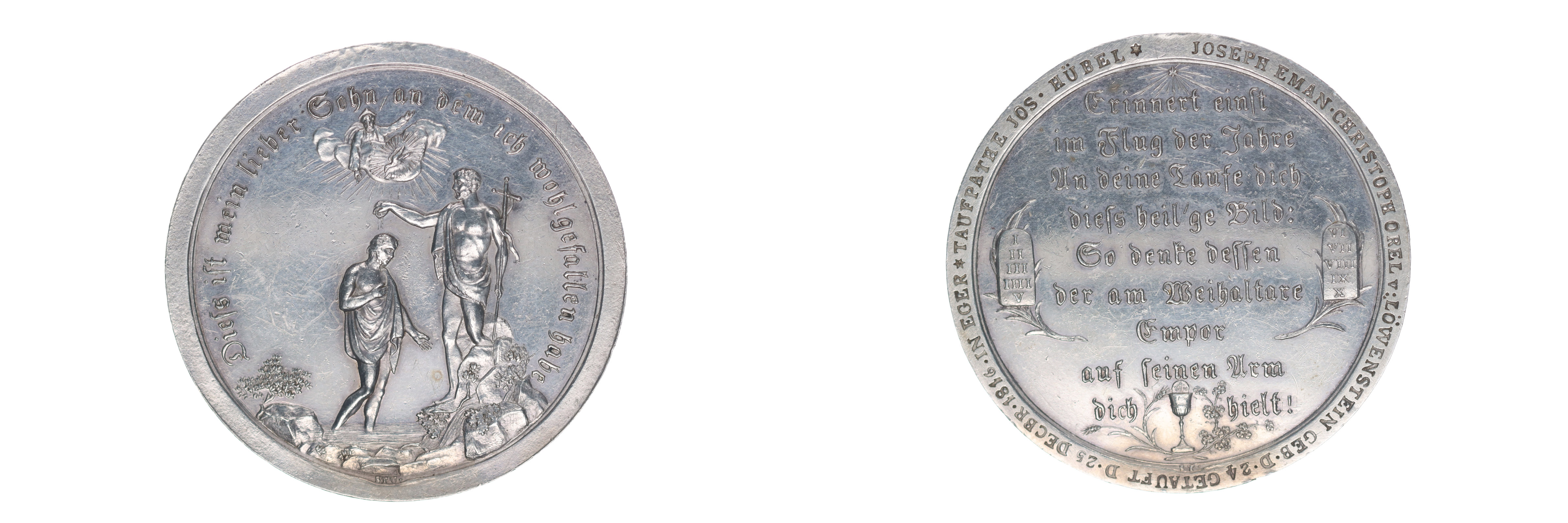 F.Stuckhart - sv.Jan křtí Krista, nad nimi Bůh Otec a Duch Svatý, něm.opis schwabachem / 9řádk.něm.nápis schwabachem, na bocích tabulky z Desatera, dole kalich s hostií, na okraji vyryté věnování Joseph Eman Christoph Orel v.Löwanstein in Eger 25.12.1816 Sign., Ag 49 mm, 34,56 g, Gr.1411