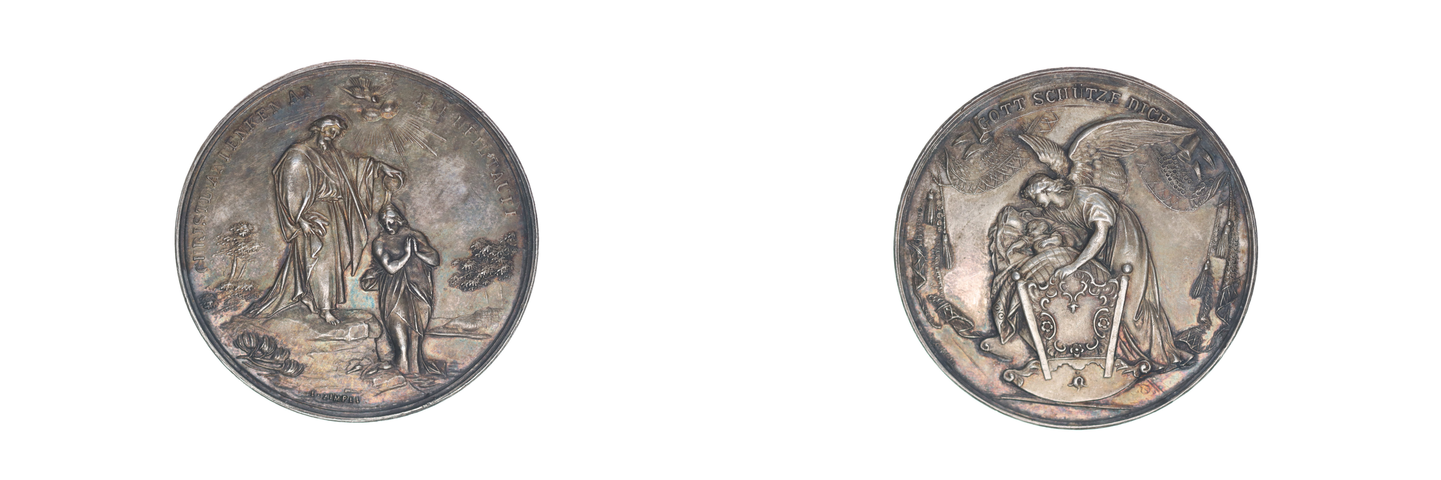 L.Zimpel - Sv.Jan křtí Krista, nad nimi Duch svatý v podobě holubice, krajina se stromy, písmo / anděl nad kolébkou opis, typ se záclonovými závěsy, b.l. (kolem r.1880) Sign., Ag 42 mm, 23,05 g, Gr.1423