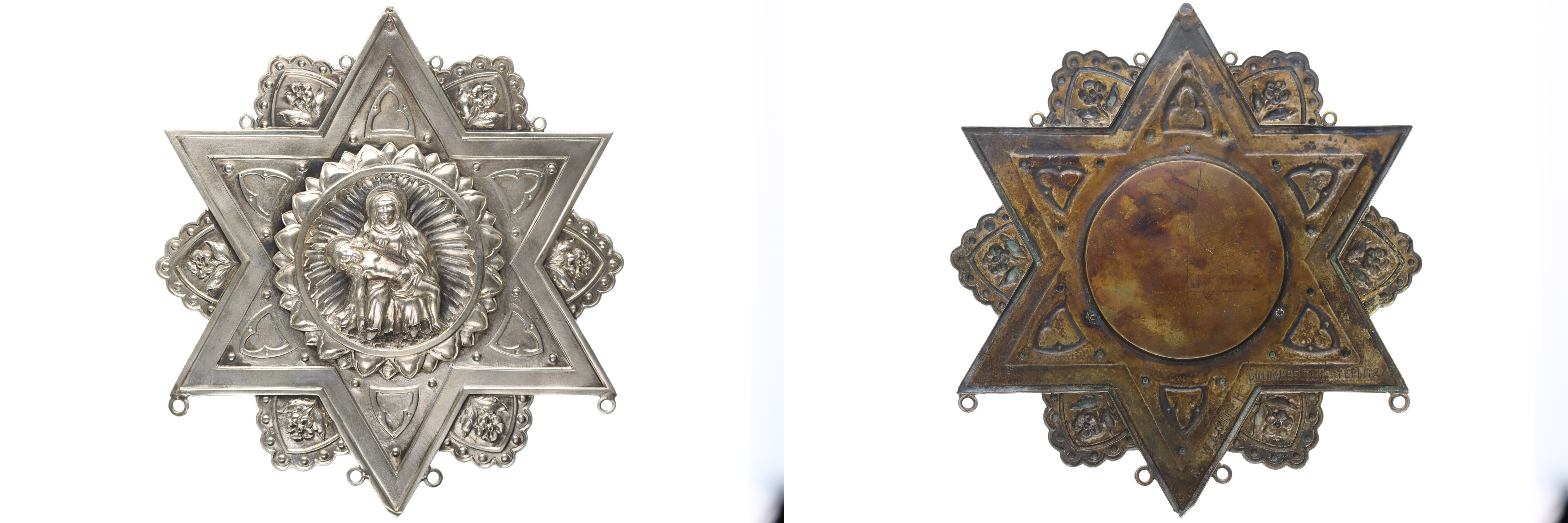 Madona s ukřižovaným Kristem (Michelangolova Pieta) ve středu velké medaile s ozdobami po obvodu v šestiramenné hvězdě Punc. (800) Ag 129 mm, 73,17 g, v rev.znač. A.Wagner Goldarbeiter Teplitz_jednostr.