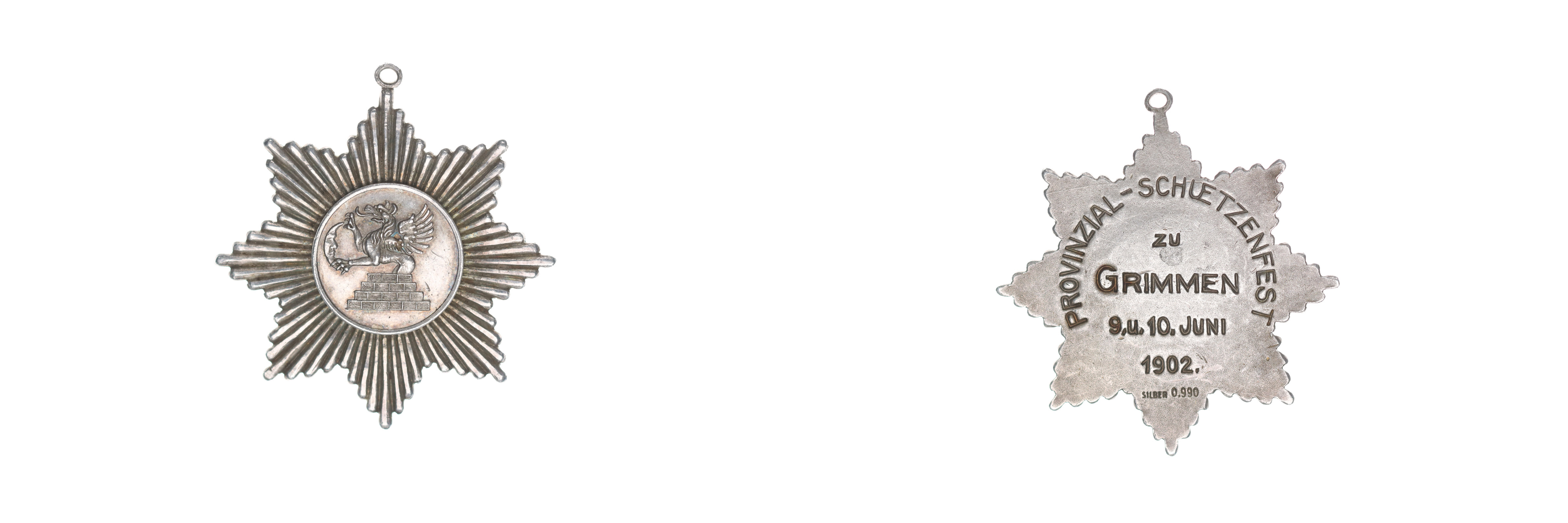 Německo - Pommern (Pomořany) - střelecký odznak k regionální střelecké slavnosti 9. a 10.6.1902 8cípá paprskovitá hvězda, uprostřed pomořanský znak, Punc.0,990 Ag 36,5x36,5 mm_orig.ouško