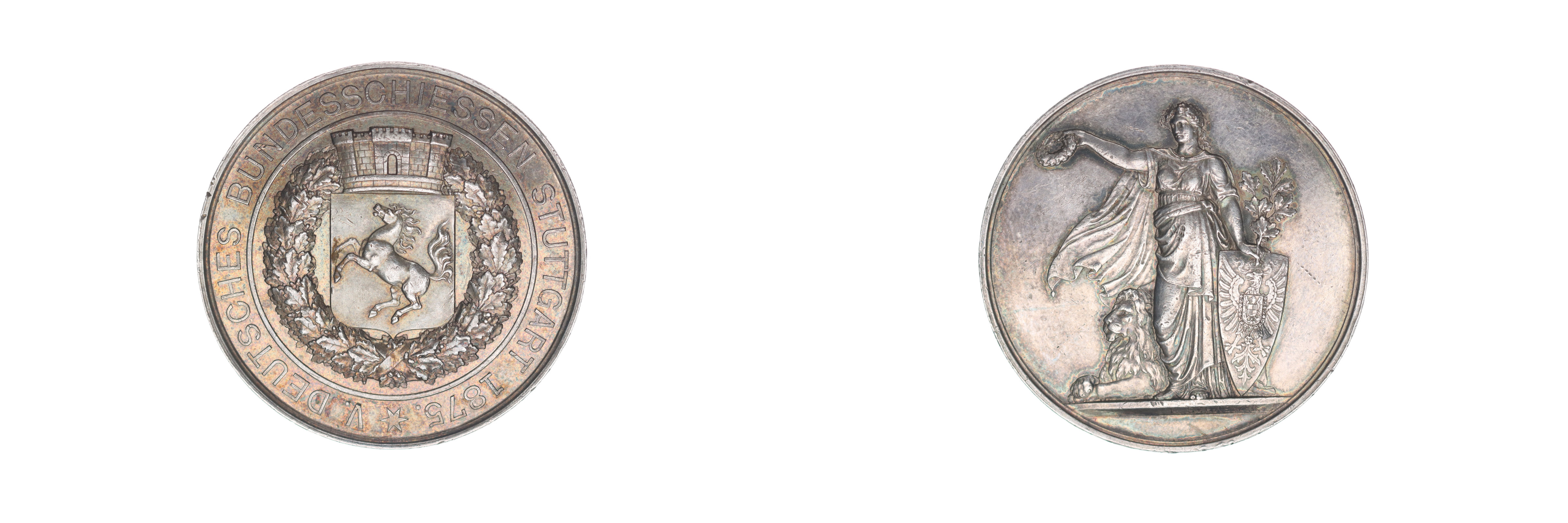 Německo - Stuttgart - V.německé střelby 1875 Korunovaný znak města ve věnci, opis / stojící alegorická postava s věncem štítem, Sign.K.Schwenzer, Ag 42 mm, 23.74 g, Bur.741