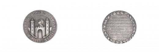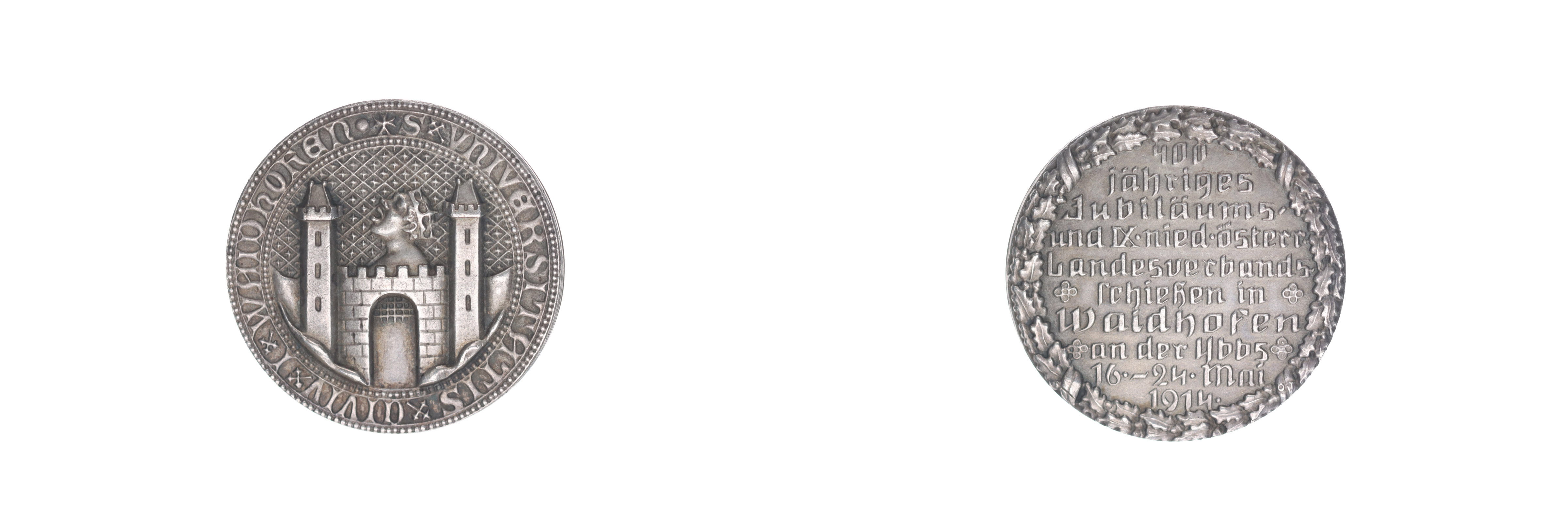 Rakousko - Waidhofen - medaile k 400.výročí a IX.dolnorakouské střelby 16.-.24.5.1914, znak města, opis / 10řádk.nápis ve věnci Nesign., Punc. Ag 36 mm, 19,95 g