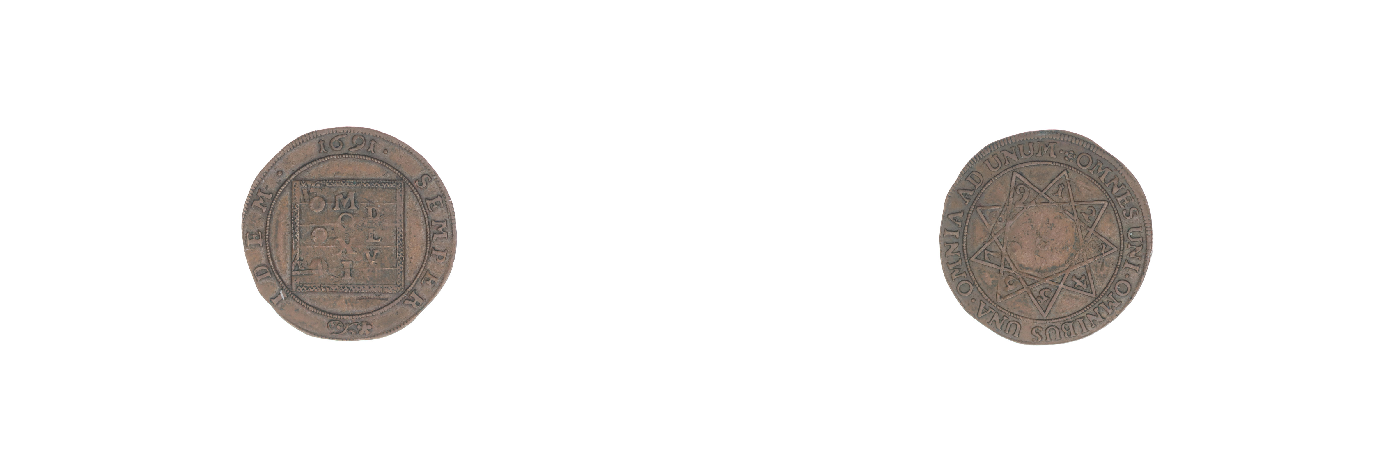 Početní fenik 1691, ve středu abakus s římskými číslicemi, latinský opis / 9cípá hvězda s číslicemi 1-9, uprostřed 0, latinský opis OMNES UNI OMNIBUS OMNIA OMNIA AD UNUM, Cu 25,5 mm Appel.4032, tab.8/15, ČNS Šumperk.82/747_dr.ned. RRR!