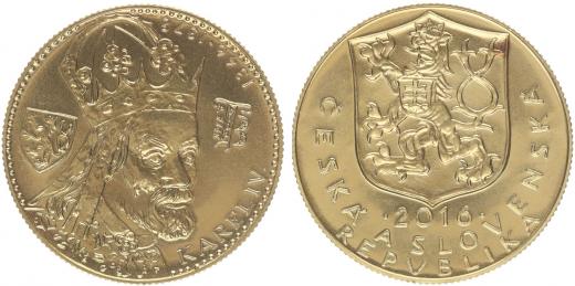 Dukát - k 700.výr.narození Karla IV. 1316 - 2016 Portrét čelně mírně zprava (vzor dukát 1978) / čs.znak, opis Česká a slovenská republika, ryz.986, 19,75 mm, 3,49 g, náklad 300 ks, čís.153 minc.Kremnice_orig.etue se smalt.českým lvem + certifikát