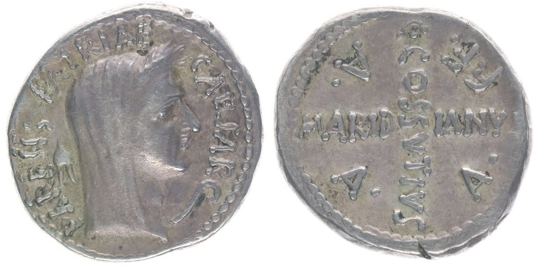 AR Denár, hlava Caesara zprava / nápis v kříži, opis Craw.480/19, Ves.1381