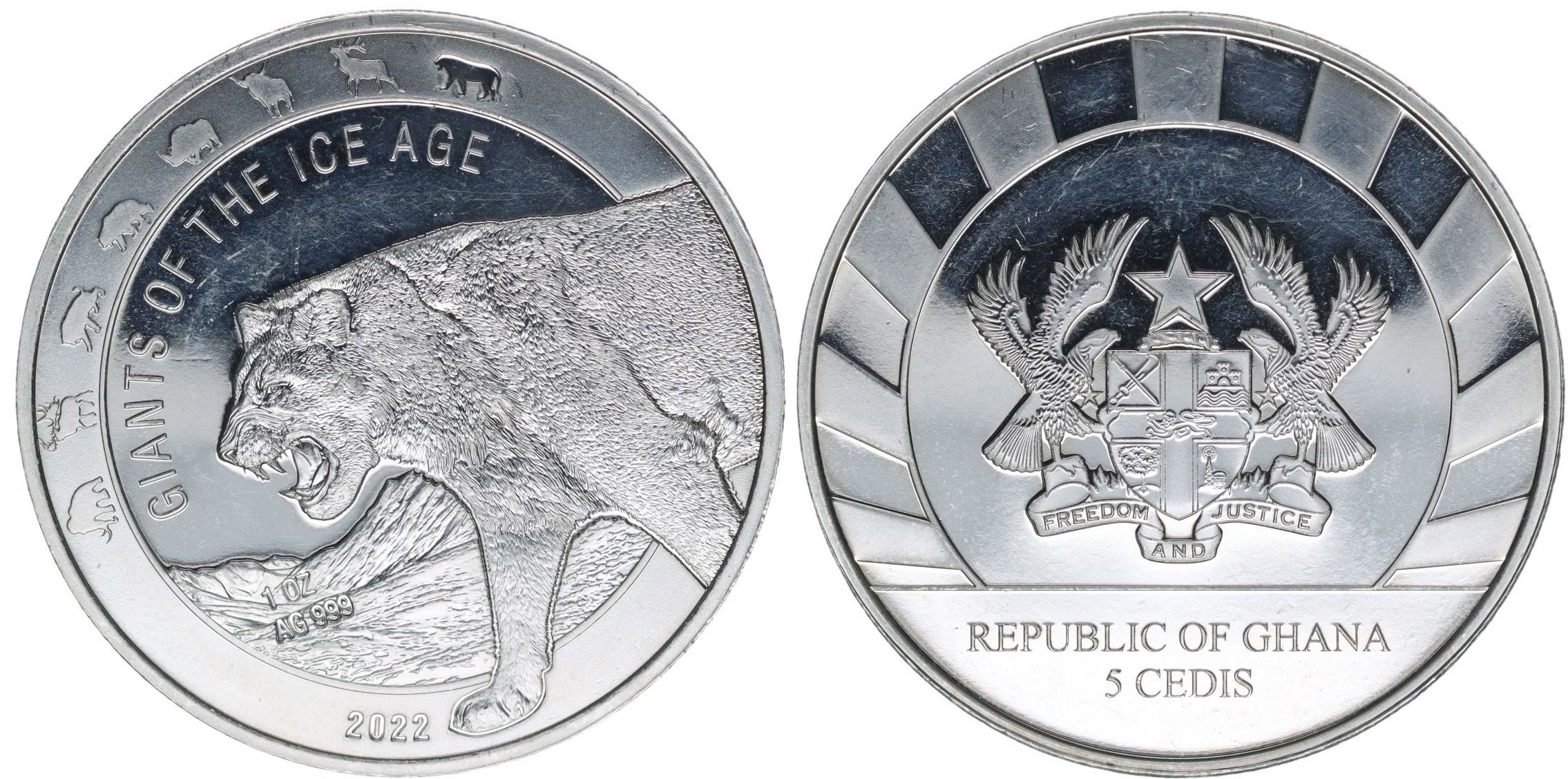 5 Cedis 2022, Ag unce 999, lev jeskynní - ze série velká zvížata doby ledové_orig.kapsle
