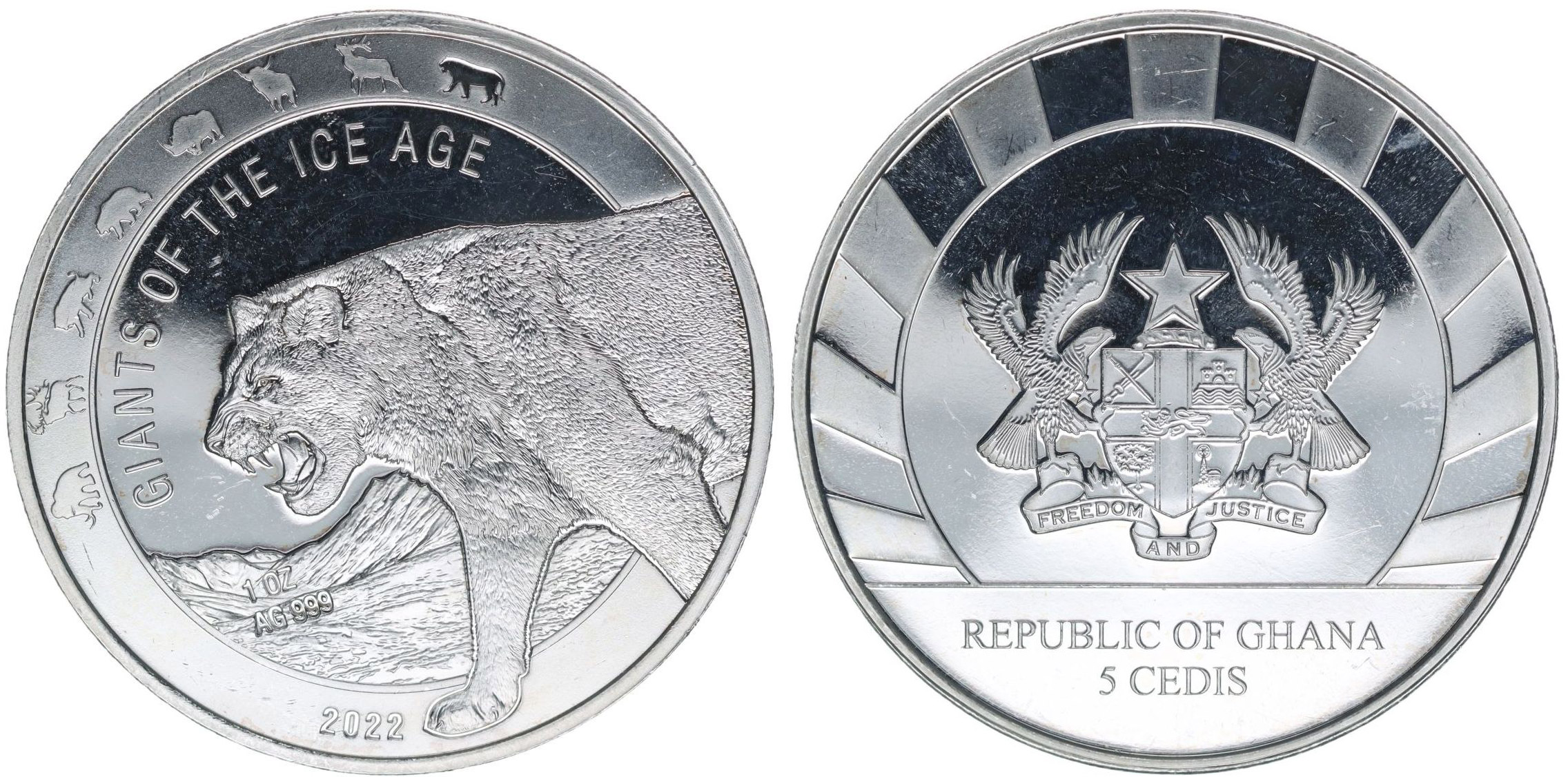 5 Cedis 2022, Ag unce 999, lev jeskynní - ze série velká zvížata doby ledové_orig.kapsle