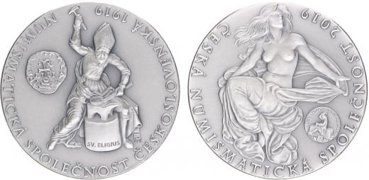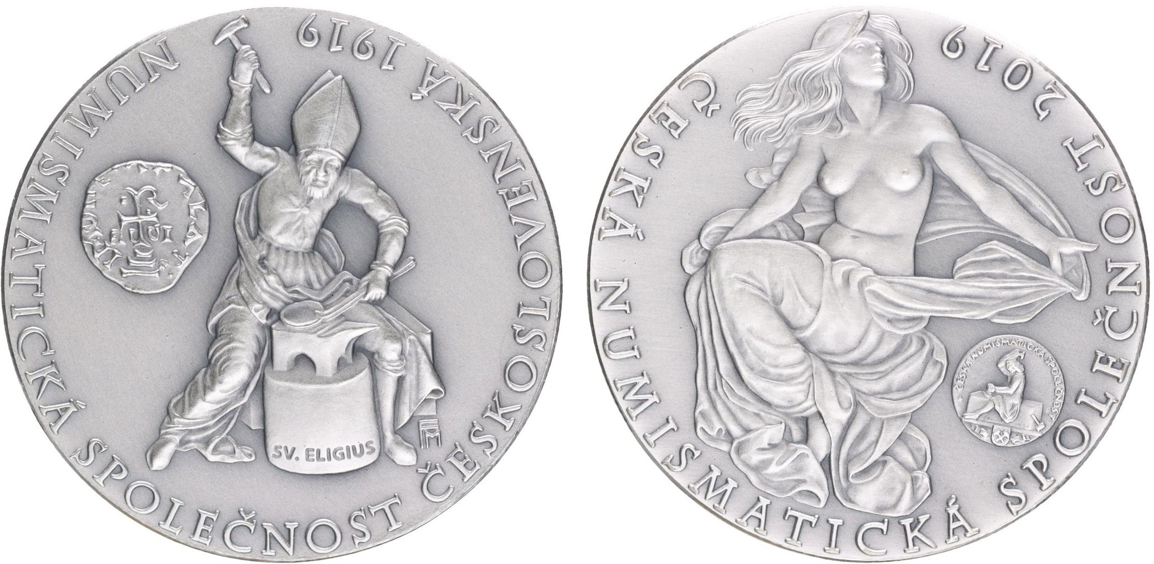 M.Filová - medaile k 100.výročí založení České numismatické společnosti - 1919 - 2019, sedící sv.Eligius, opis / sedící alegorická ženská postava, opis, Sign., ryz.999/1000, Ag 50 mm, 63,3 g (3 unce) MF.A1/47b_orig.etue