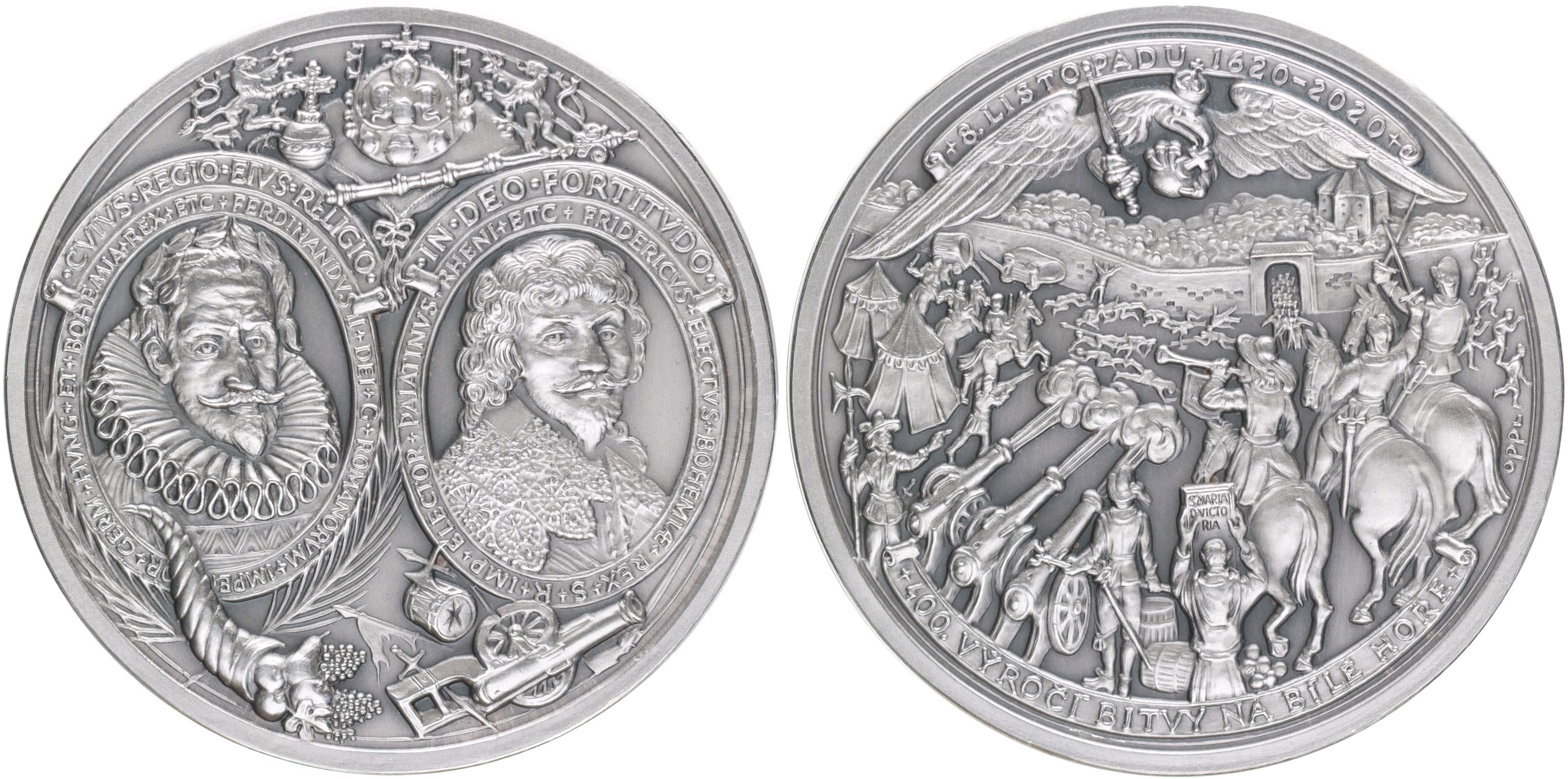 Medaile k 400.výročí bitvy na Bílé Hoře 8. listopadu 1620 Ve dvou medailonech Ferdinand II. a Fraidrich Falcký, zdobený okraj / bitevní scéna, opis, Sign., Punc.900, Ag 70 mm, 247,11 g nákl.60 ks_orig.repre etue