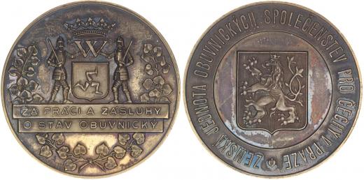Zem. jednota obuvnických společenstev pro Čechy v Praze 2 rytíři drží W s korunkou 1390, opis / český znak ve věnci, Za práci a zásluhy o stav obuvnický, Sign., Bronz 42 mm_orig.etue